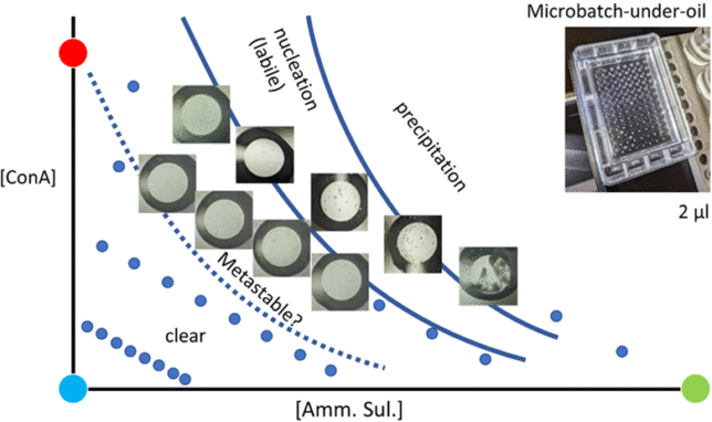 Figure 1. The rapid determination of a protein’s phase diagram using a microbatch-under-oil format. Blue circles indicate the conditions that were tested. Images of the wells are shown in conditions of interest. All points on the accessible phase diagram can be reached by mixing the three ingredients shown: protein stock (red circle), precipitant or cocktail stock (green circle) and a diluent, normally water (cyan circle). To find the border of the metastable zone (dotted line) the experiment was repeated with the addition of a seed-stock (results not shown).